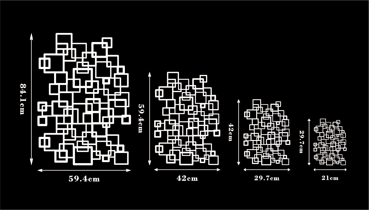 29,7cm x 21 cm, 42 cm x 29,7 cm, 59,4 cm x 42 cm, 84,1 cm x 59,4 cm